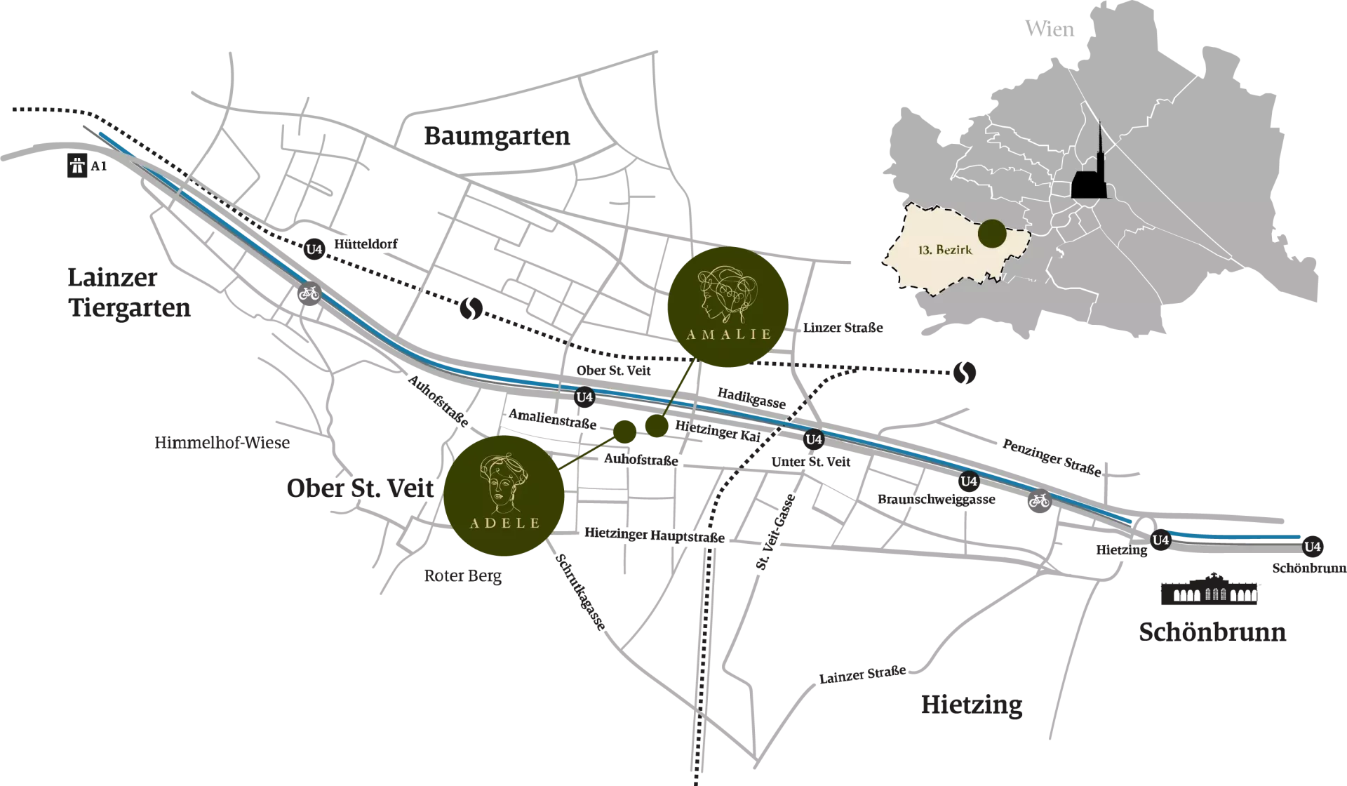Vom urigen Heurigen über legendäre Kaffeehäuser bis zu den Tafelspitz-Spezialitäten des Plachutta Stammhauses – im charmanten Ober-Sankt-Veit stimmt einfach alles. Die U4-Station Ober-Sankt-Veit ist keine 200 Meter entfernt und für kurze Wochenendtrips aufs Land ist der Dreizehnte für den Individualverkehr ebenso ideal: Im Nu gelangt man über die Westausfahrt bequem auf die A1 und A2 oder über die Tangente an jeden anderen Teil der Stadt.